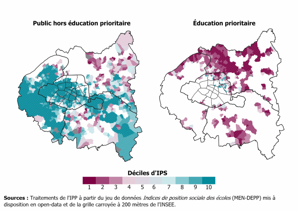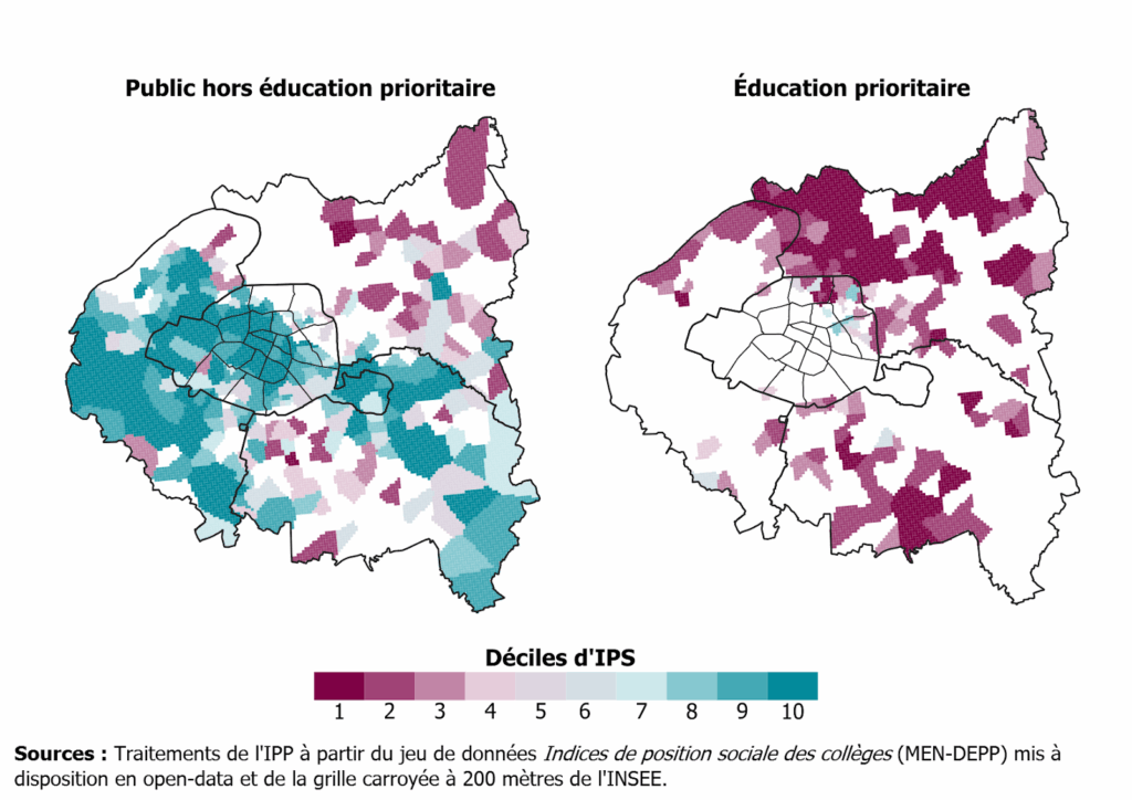 L’indice de position sociale (IPS), calculé pour chaque élève à partir de la profession de ses représentants légaux, permet de rendre compte de la sociologie des publics accueillis dans les établissements scolaires2. Les cartes suivantes, qui présentent les résultats séparément selon que les établissements se trouvent en éducation prioritaire ou hors éducation prioritaire, rendent bien compte de ce phénomène3.