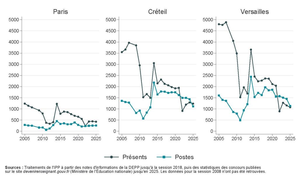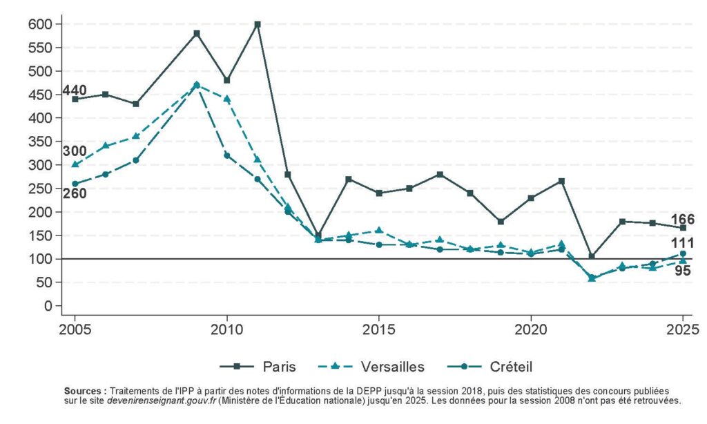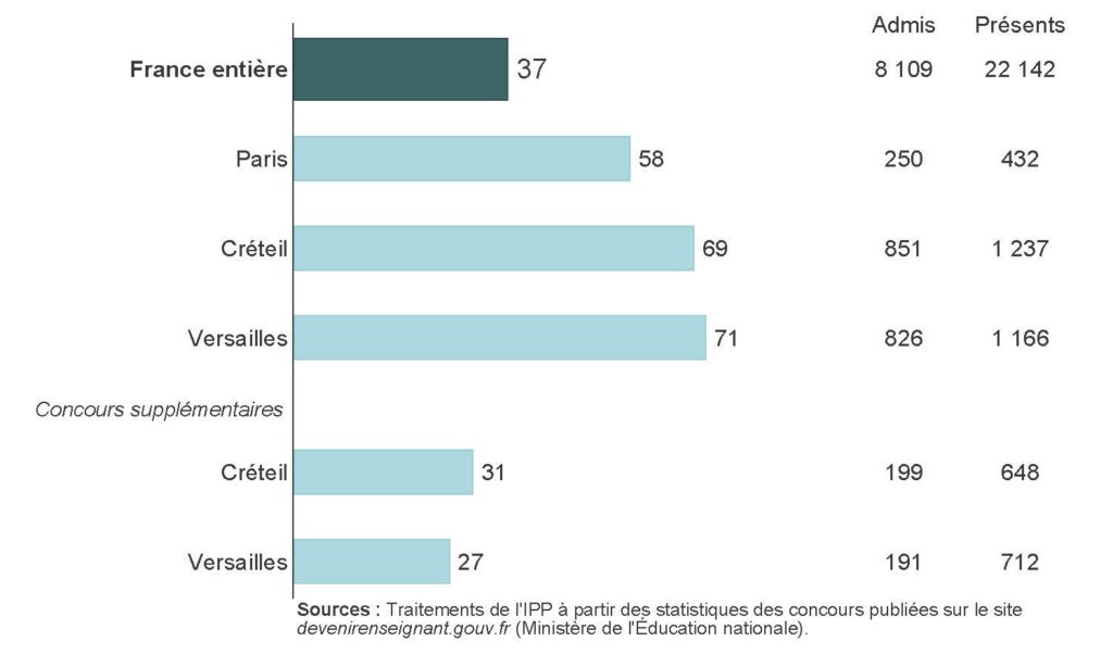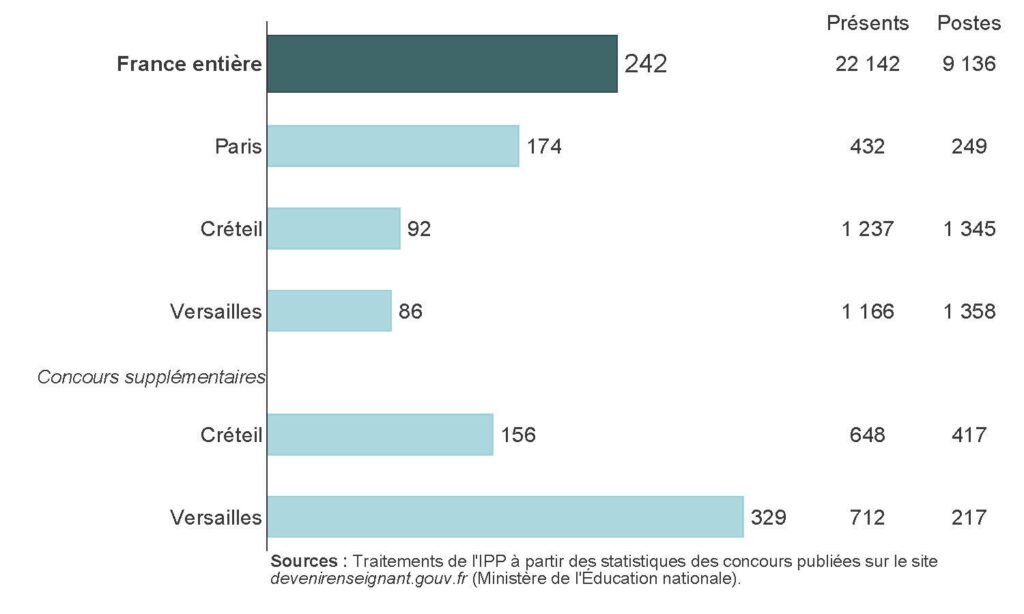 Dans le premier degré, les concours de recrutement des professeurs des écoles ne sont pas organisés au niveau national : pour être affecté à une école publique, les aspirants enseignants postulent au sein d’une académie donnée. L’étude du nombre de postes proposés, de candidats présents, et d’admis permet de constater la sélectivité contrastée des académies franciliennes.