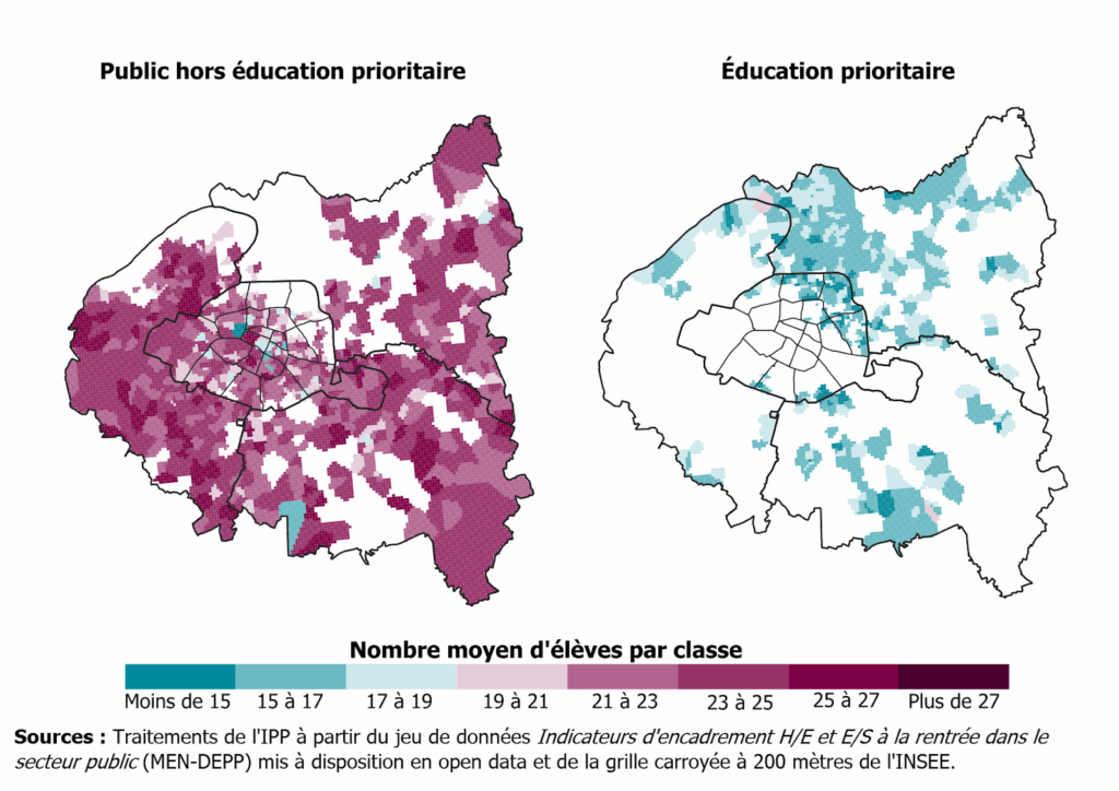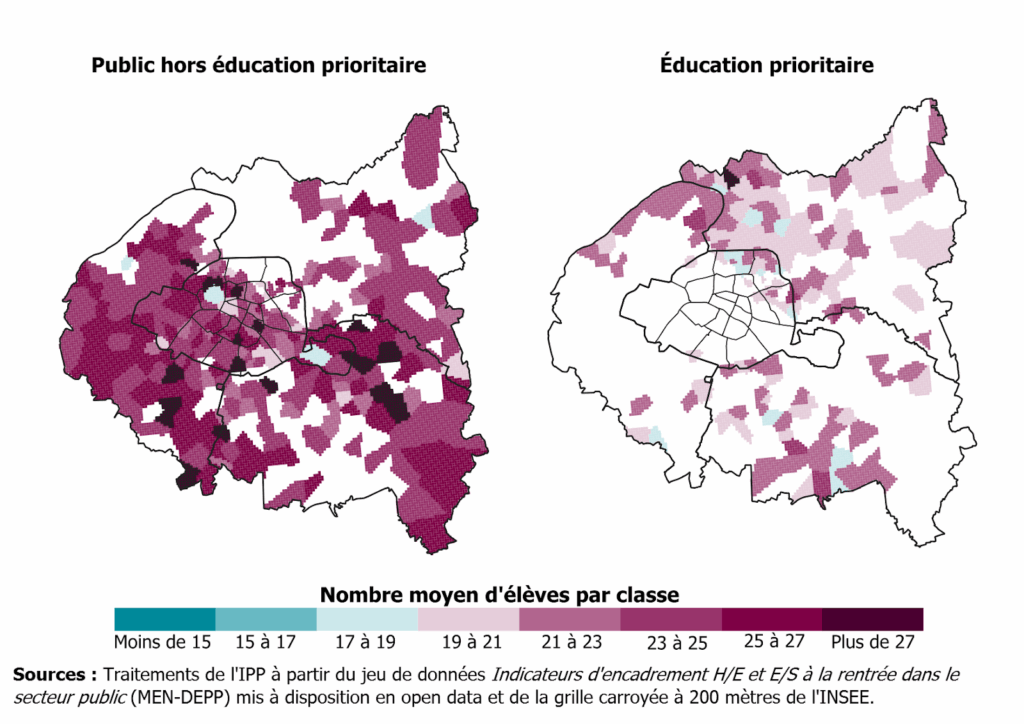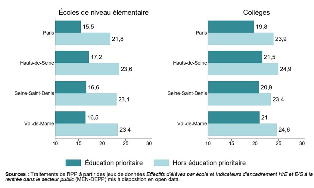 Le classement en éducation prioritaire permet aux établissements scolaires d’obtenir des moyens spécifiques. Dans le premier degré, cela se traduit notamment par le dédoublement des classes de CP et CE1 et, depuis la rentrée 2021, des classes de grande section de maternelle. Les cartes suivantes illustrent bien ce phénomène : la quasi-totalité des écoles publiques de niveau élémentaire classées en éducation prioritaire ont une taille moyenne des classes inférieure à 19 élèves (Figure 2a). À l’inverse, la taille des classes dépasse 19 élèves dans la plupart des établissements publics hors éducation prioritaire. Quelques exceptions subsistent, notamment à Paris. Comme le révélait le rapport de l’IPP sur les perspectives budgétaires4, pour un type d’établissement donné (en éducation prioritaire ou non), le nombre moyen d’élèves par classe en Seine-Saint-Denis est supérieur à celui des écoles parisiennes (Figure 3).