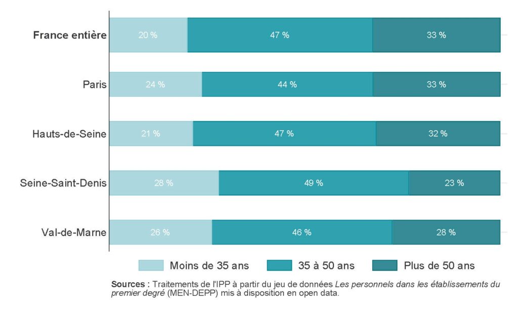 Par comparaison avec le second degré, les contrastes dans les caractéristiques des enseignants du premier degré apparaissent donc limités en Île-de-France. Ces indicateurs ne traduisent néanmoins qu’un pan de la réalité. En particulier, l’étude des statistiques sur les concours de recrutement des enseignants suggèrent que ceux qui exercent dans l’académie de Paris sont issus d’un processus bien plus sélectif que ceux exerçant dans les départements limitrophes.