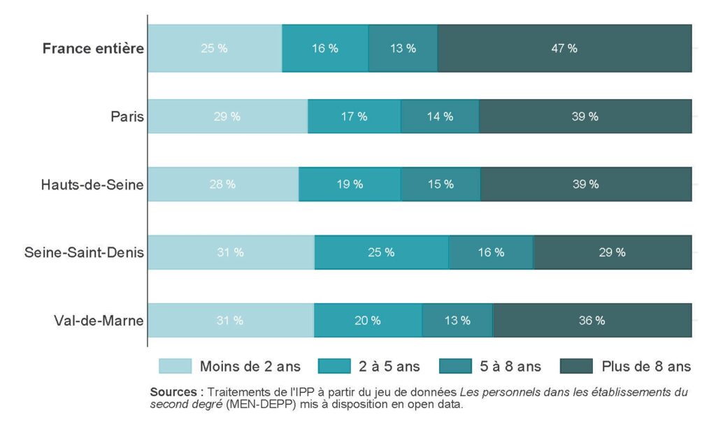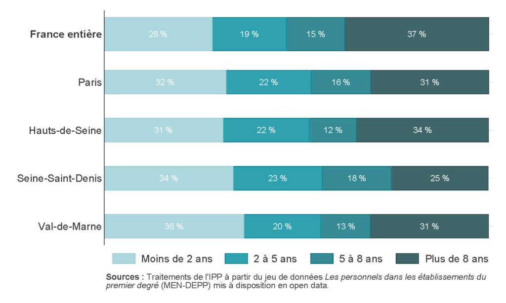 La Figure 4 montre qu’à l’échelle nationale et dans le secteur public, 20 % des enseignants du premier degré ont moins de 35 ans. En Île-de-France, cette proportion est plus élevée, surtout en Seine-Saint-Denis (28 %) et, dans une moindre mesure, dans le Val-de-Marne (26 %). On observe aussi que les professeurs des écoles du secteur public restent en moyenne moins longtemps dans leur établissement lorsqu’ils exercent à Paris et dans les départements limitrophes que dans le reste du pays (Figure 5).