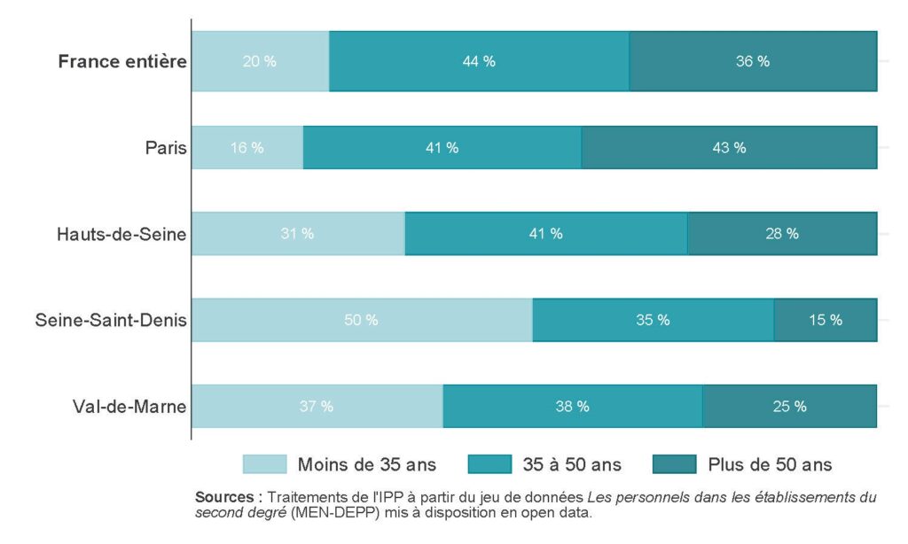 Comme dans le premier degré, au niveau national, un enseignant de collège public sur cinq à moins de 35 ans (Figure 6). Cette proportion est un peu plus faible à Paris (16 %). En revanche, les départements limitrophes se caractérisent par une surreprésentation marquée des jeunes enseignants : 31 % dans les Hauts-de-Seine, 37 % dans le Val-de-Marne et jusqu’à 50 % en Seine-Saint-Denis. Le rapport s’inverse lorsqu’on s’intéresse aux enseignants de plus de 50 ans : ils représentent 43 % des effectifs à Paris, soit bien plus que la moyenne nationale (36 %), mais seulement 15 % en Seine-Saint-Denis. Pour le résumer d’une manière quelque peu caricaturale, la Seine-Saint-Denis est un département où l’on commence sa carrière, Paris plutôt une académie où on la termine.