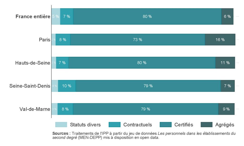 Ces difficultés de recrutement pourraient expliquer la forte surreprésentation des enseignants contractuels dans les écoles publiques des académies de Versailles (6,2 %) et Créteil (7,9 %) par rapport à Paris (3,1 %)8 ainsi que les taux de remplacement9 globalement plus élevés à Paris que dans ses départements limitrophes (71 % dans la capitale et dans le Val-de-Marne, mais 67 % dans les Hauts-de-Seine et 65 % en Seine-Saint-Denis).