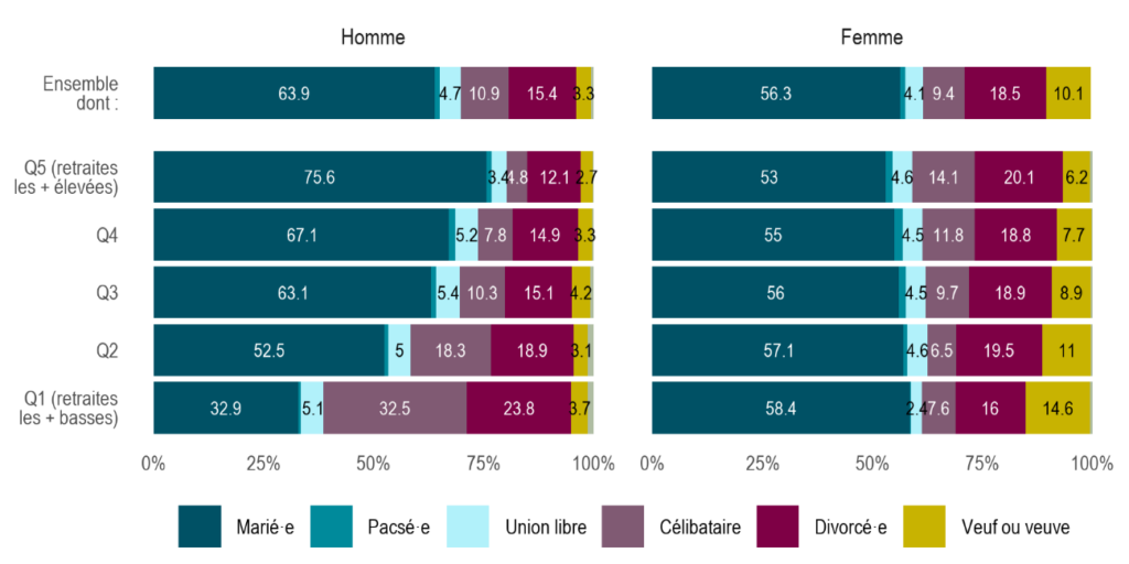 Avant de discuter des fondements normatifs d’une prise en compte du couple, il est essentiel de comprendre d’abord comment, aujourd’hui, les situations conjugales influencent concrètement les niveaux de retraite, sur la base d’une analyse statistique.